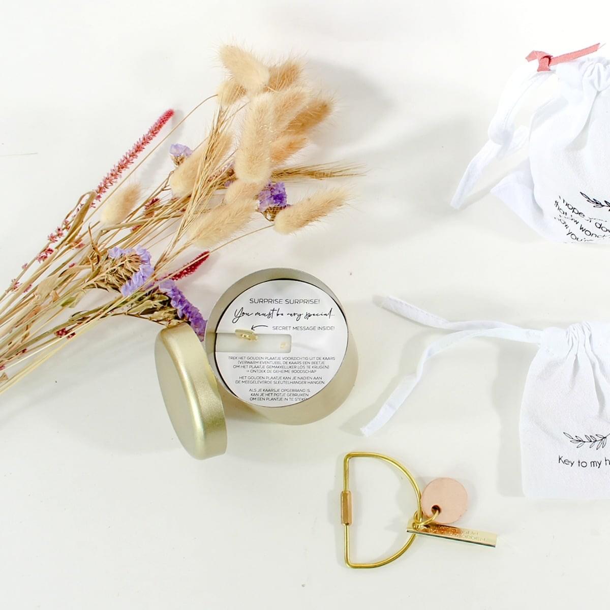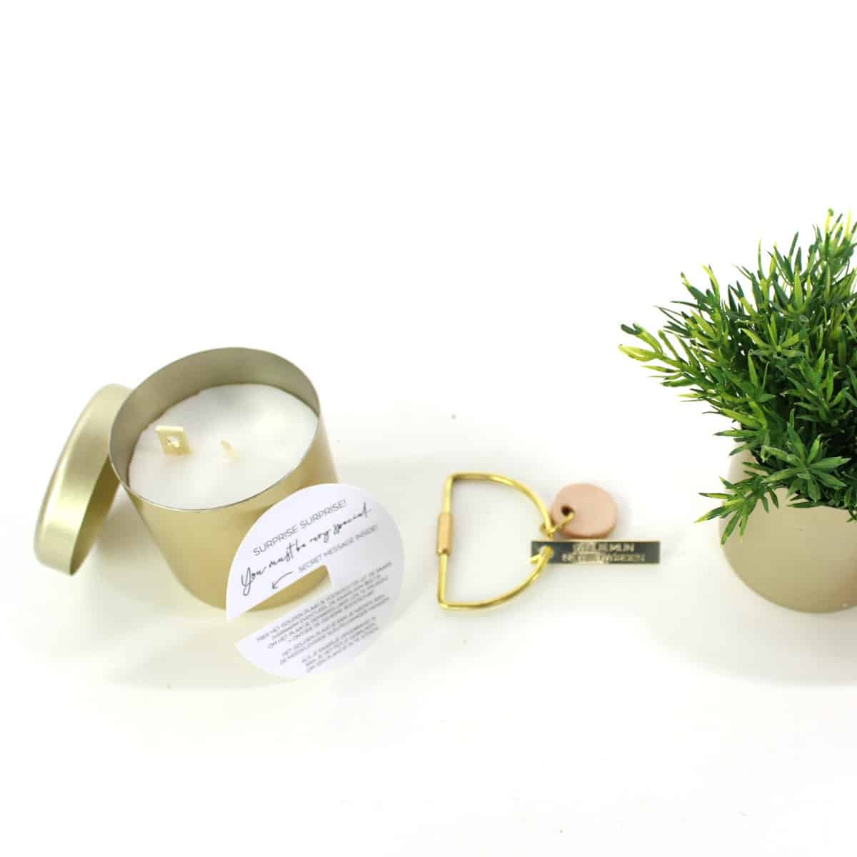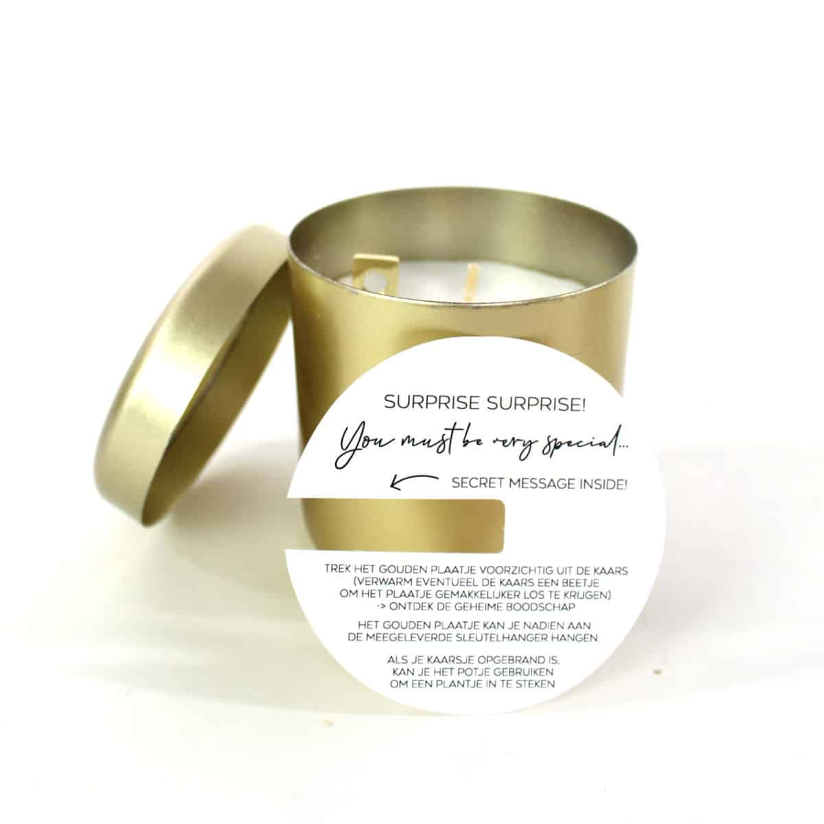 – In de heerlijk geurende kaars zit een gouden tag verstopt. Op de gouden tag staat een “geheime” boodschap. Keuze uit: You are gold, Wil je mijn meter worden?, Wil je mijn peter worden?, Allerliefste oma en Allerliefste opa.