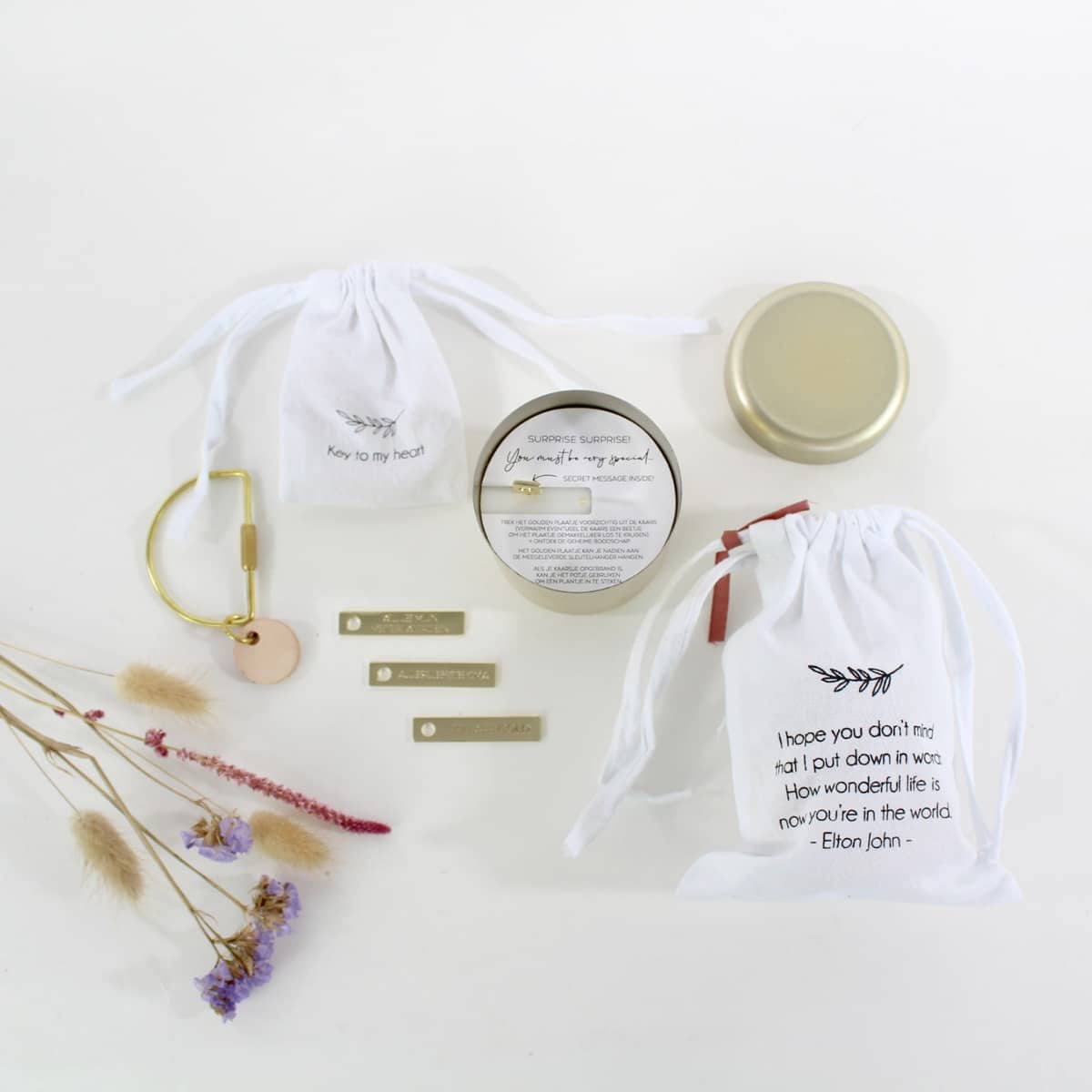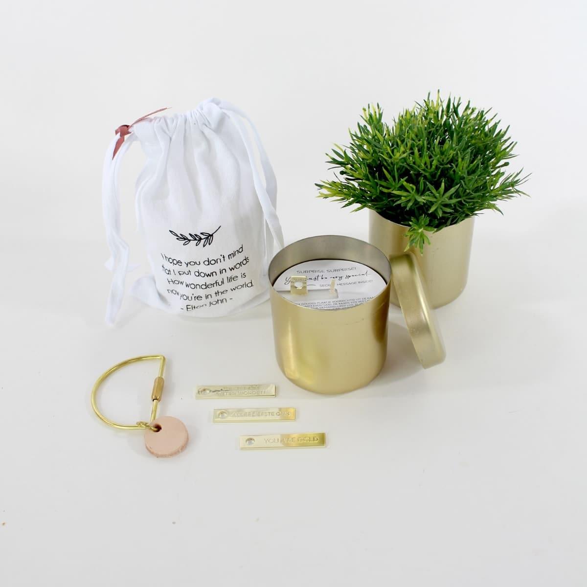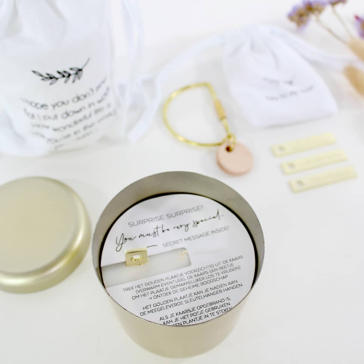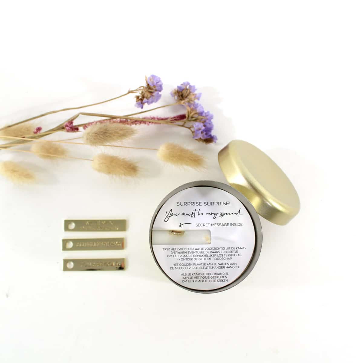 – In de heerlijk geurende kaars zit een gouden tag verstopt. Op de gouden tag staat een “geheime” boodschap. Keuze uit: You are gold, Wil je mijn meter worden?, Wil je mijn peter worden?, Allerliefste oma en Allerliefste opa.
