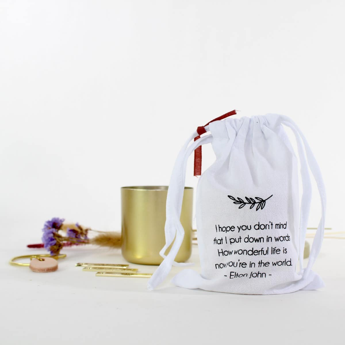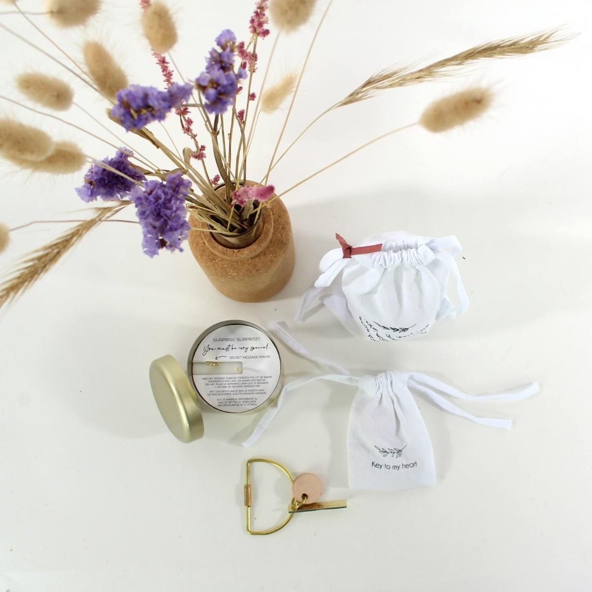 Verpakt in een leuke katoenen zakjes met opdruk.