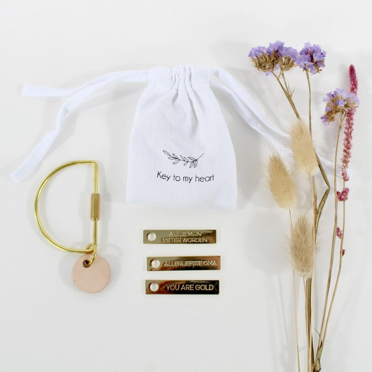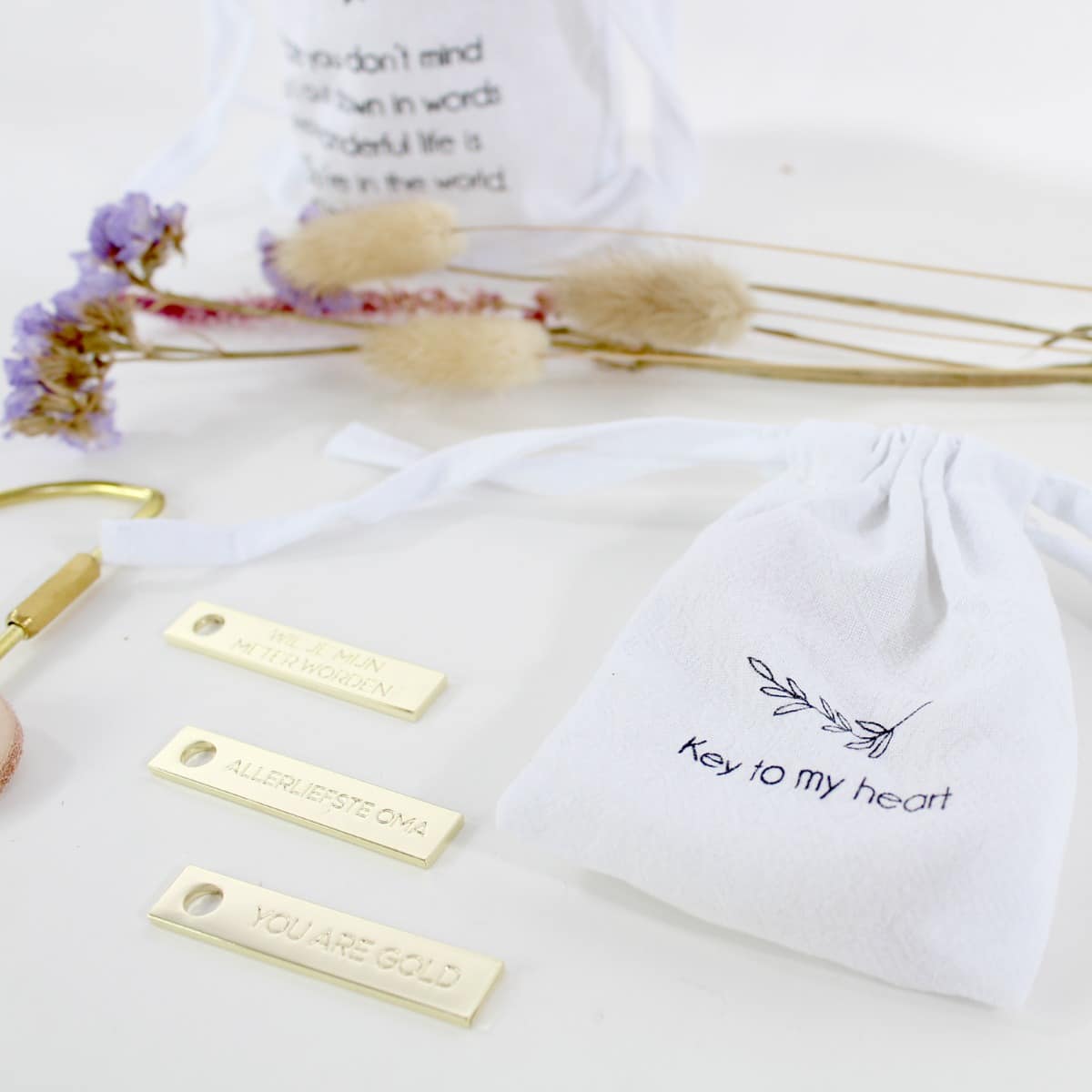 – De gouden tag kan achteraf aan de meegeleverde sleutelhanger worden gehangen. Zwarte ronde tag sleutelhanger voor peter, en opa. Roze ronde tag aan sleutelhanger voor meter en oma. You are gold: deze is standaard roze maar kan ook zwart zijn op aanvraag.