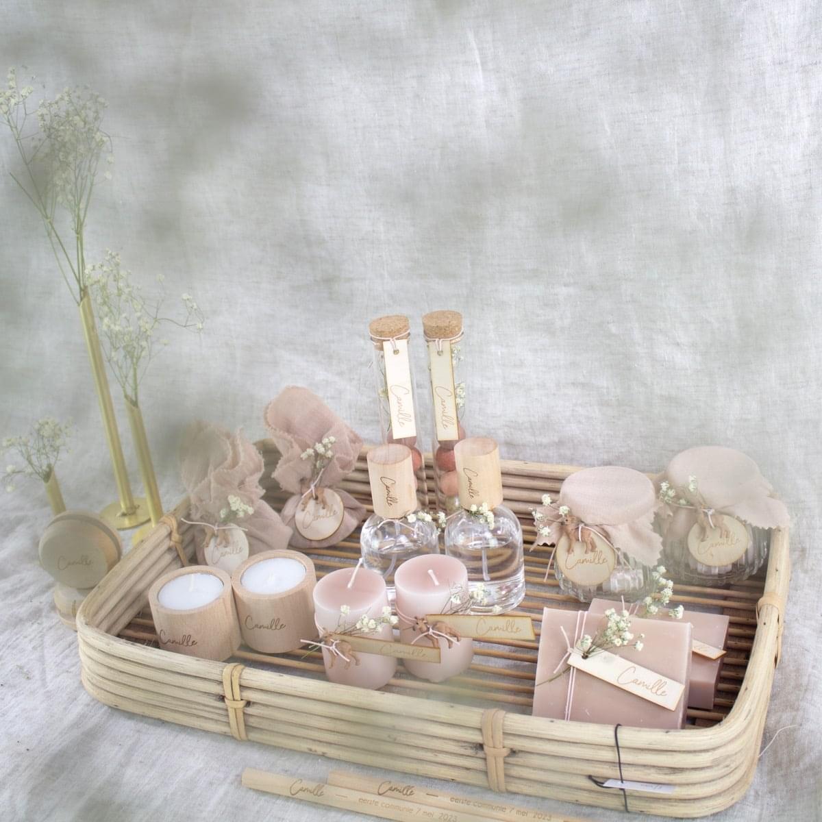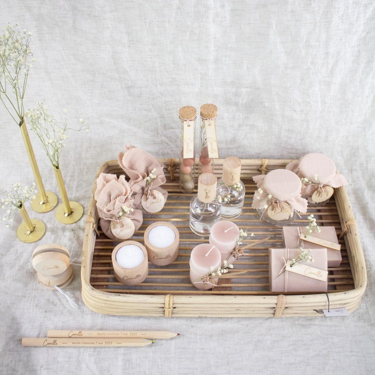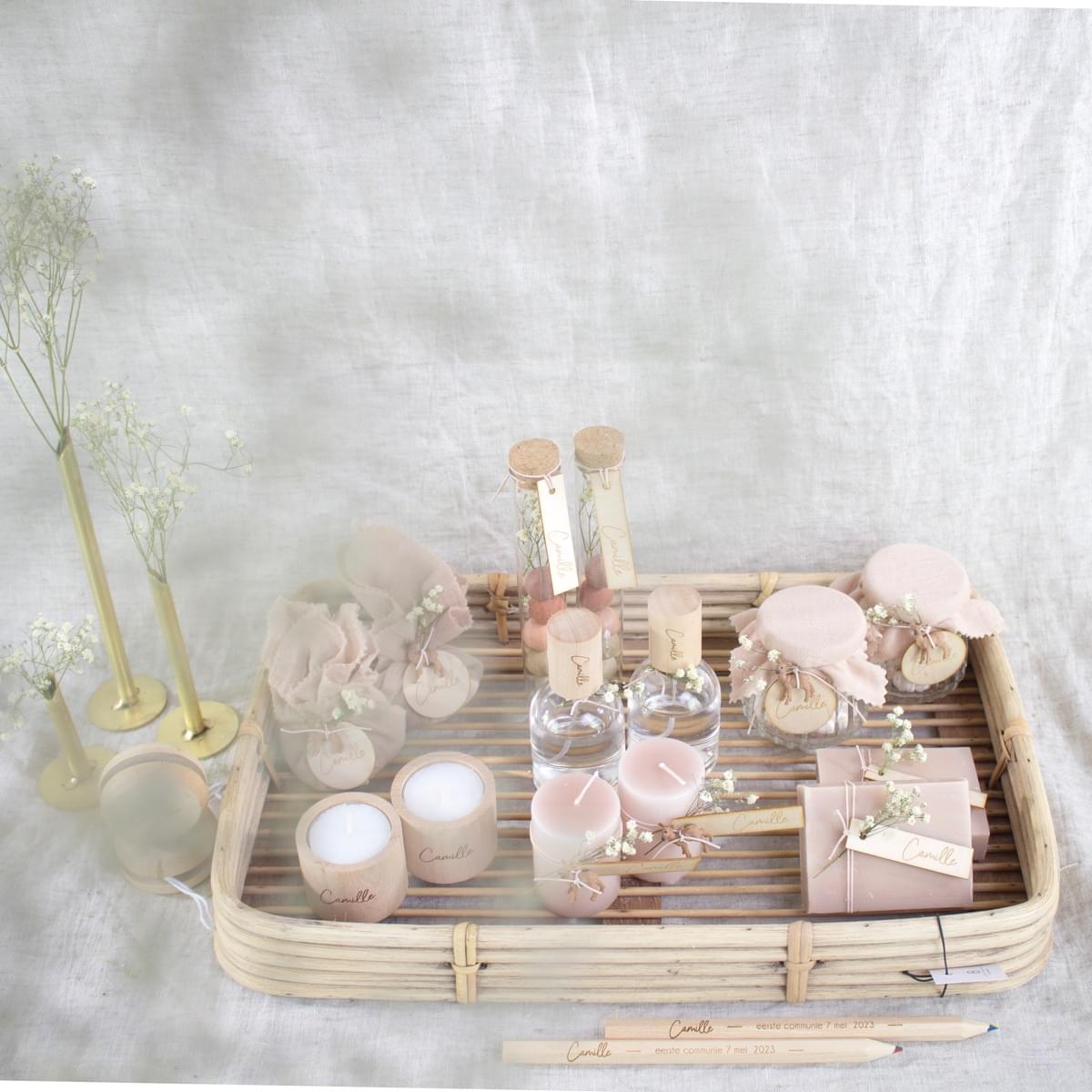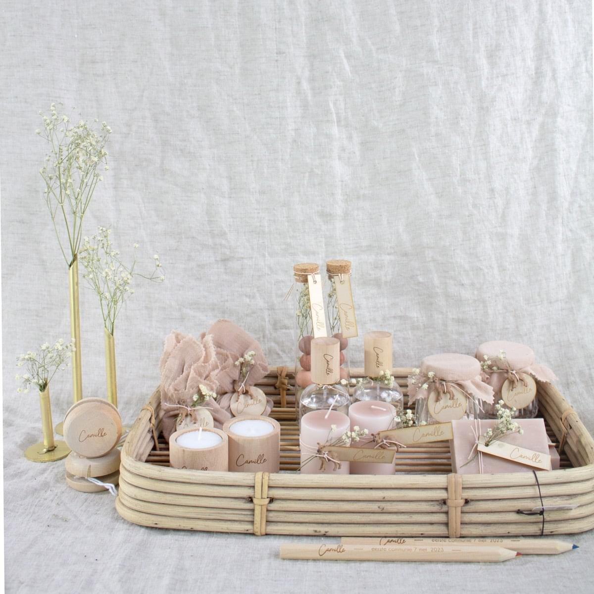 – Presentatiematerialen zijn niet inbegrepen. Het rieten mandje en de gouden vaasjes kan je apart bijbestellen. Eventueel kan je ook een houten kaarthouder voorzien om het communiekaartje of een foto erbij te presenteren.
