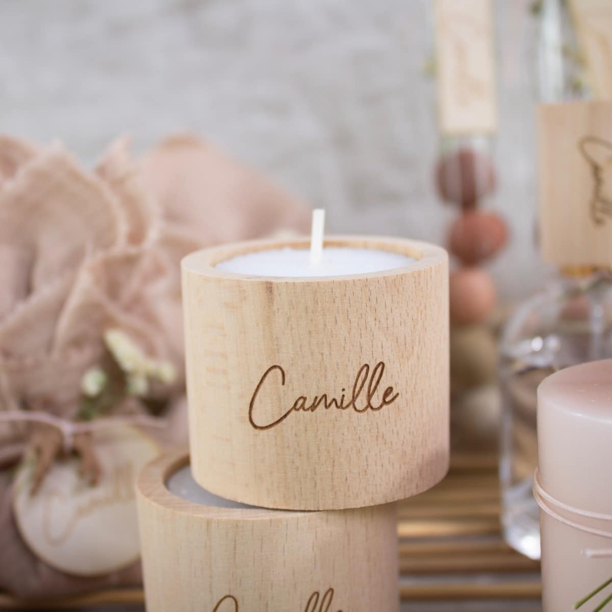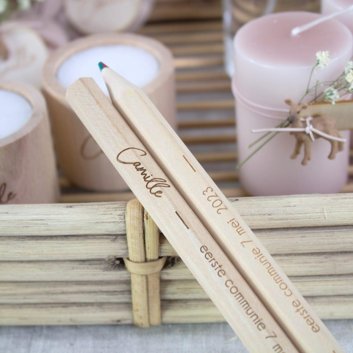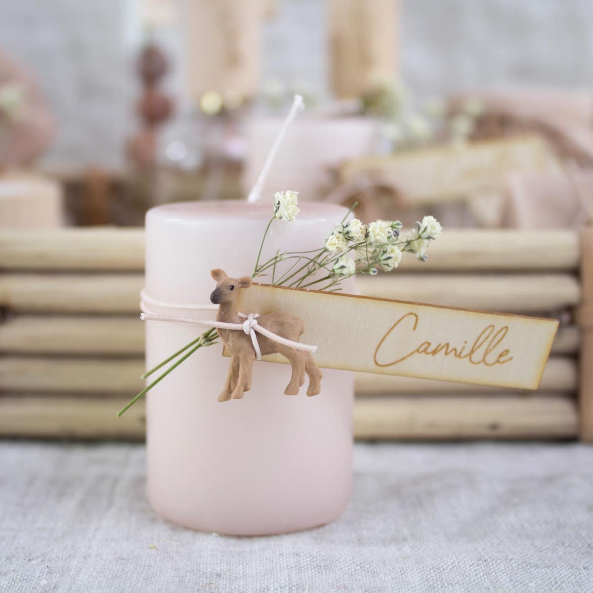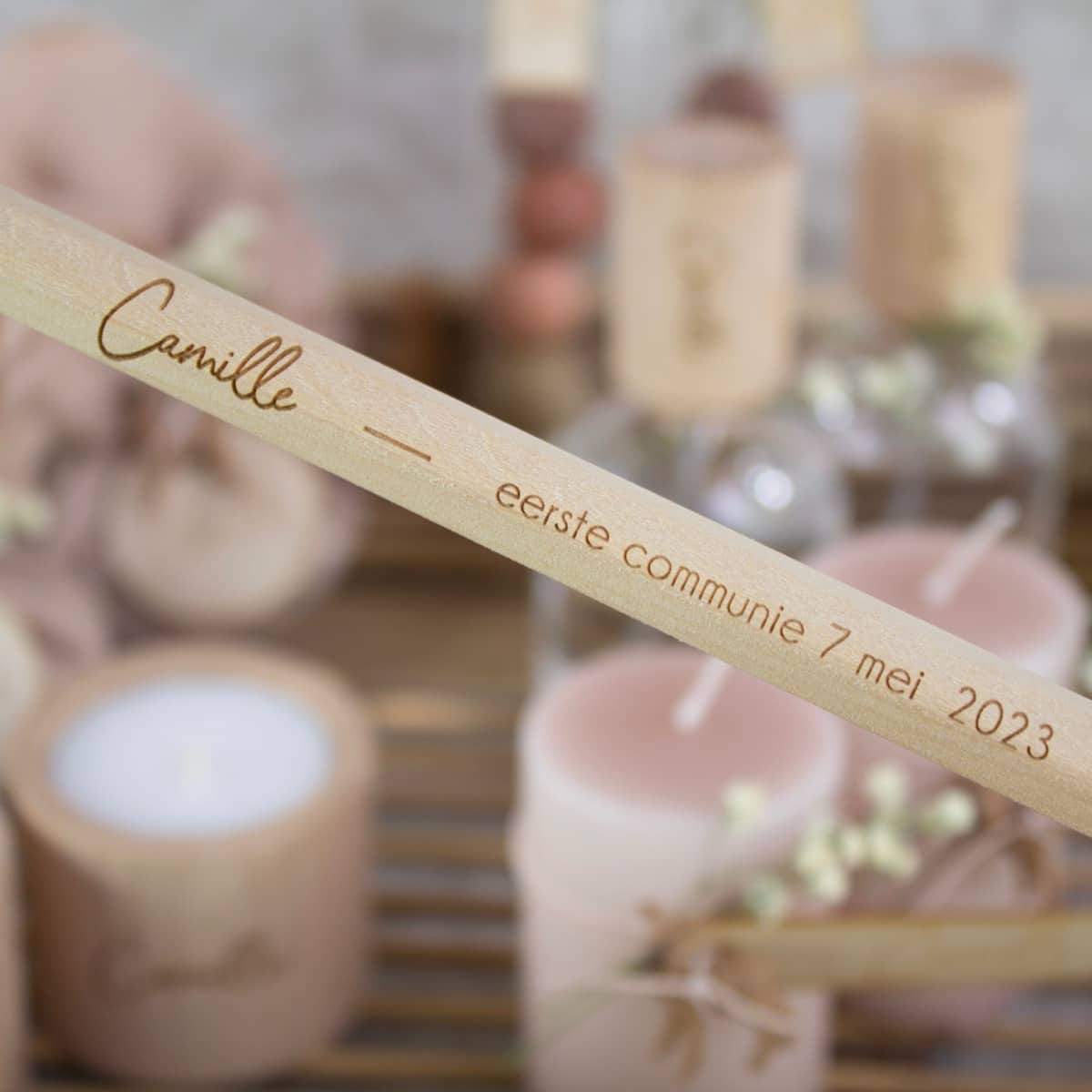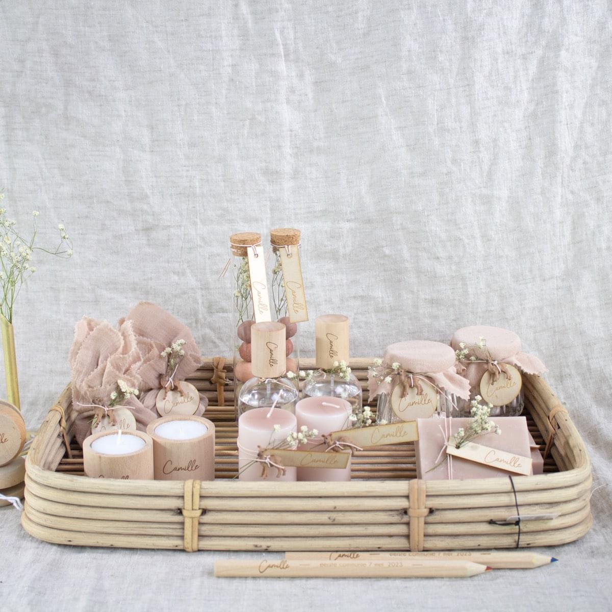 – Presentatiematerialen zijn niet inbegrepen. Het rieten mandje en de gouden vaasjes kan je apart bijbestellen. Eventueel kan je ook een houten kaarthouder voorzien om het communiekaartje of een foto erbij te presenteren.