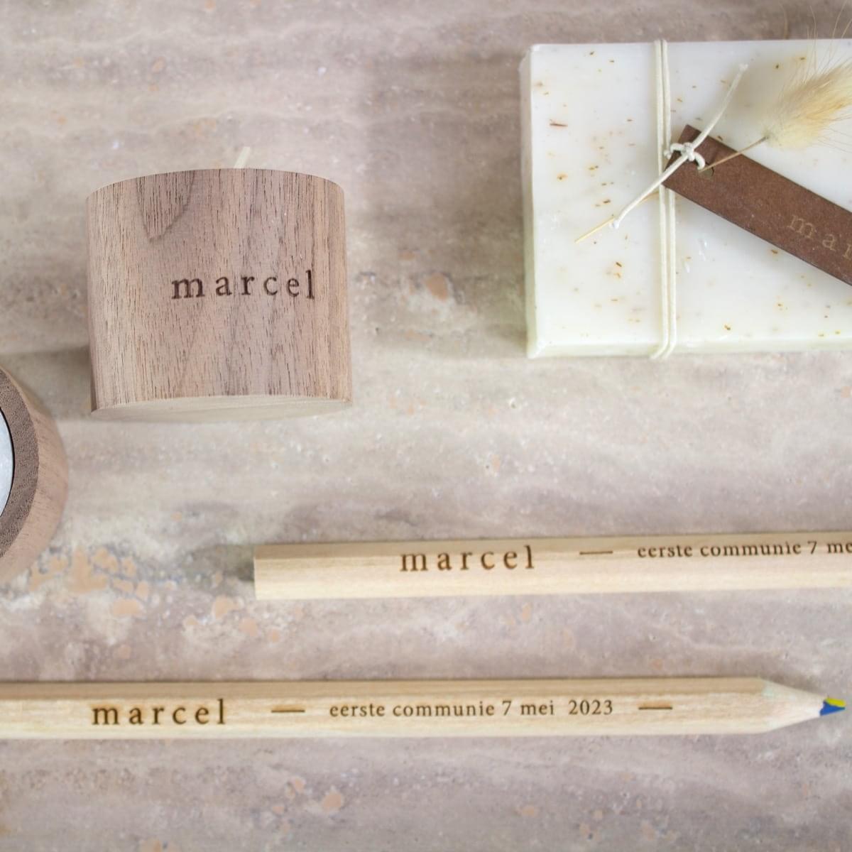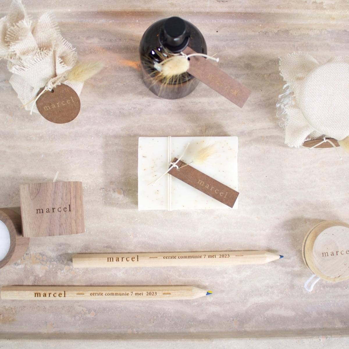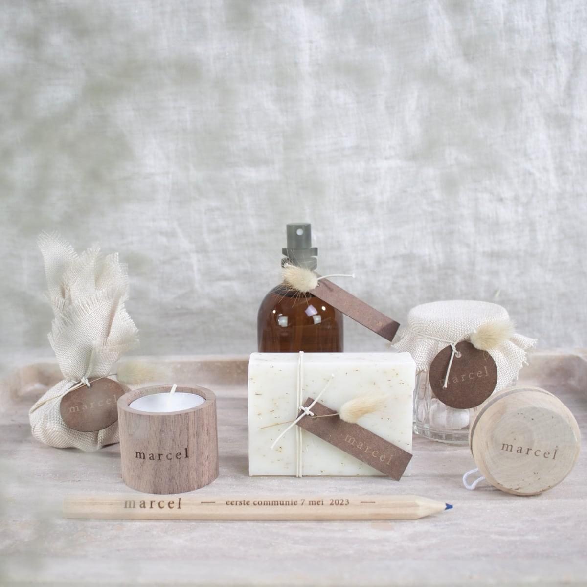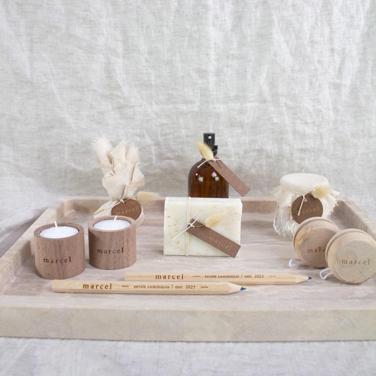 – Presentatiematerialen zijn niet inbegrepen. De marmeren tray kan je apart bijbestellen. Eventueel kan je ook een marmeren kaarthouder voorzien om het communiekaartje of een foto erbij te presenteren.