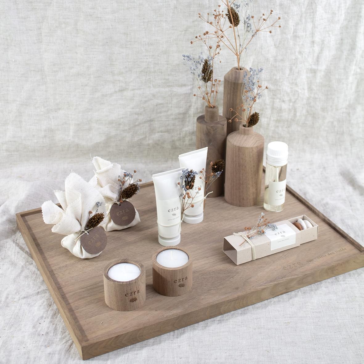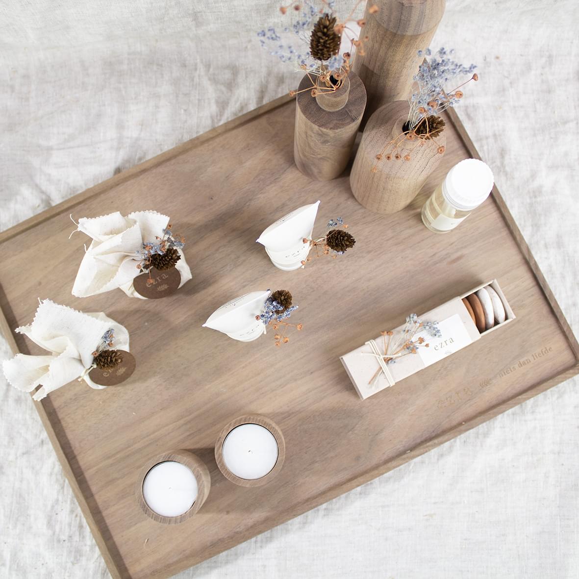 Als aanvulling op de walnoot kaarsjes, vaasjes en schaaltjes hebben we dus nu ook een walnut tray.