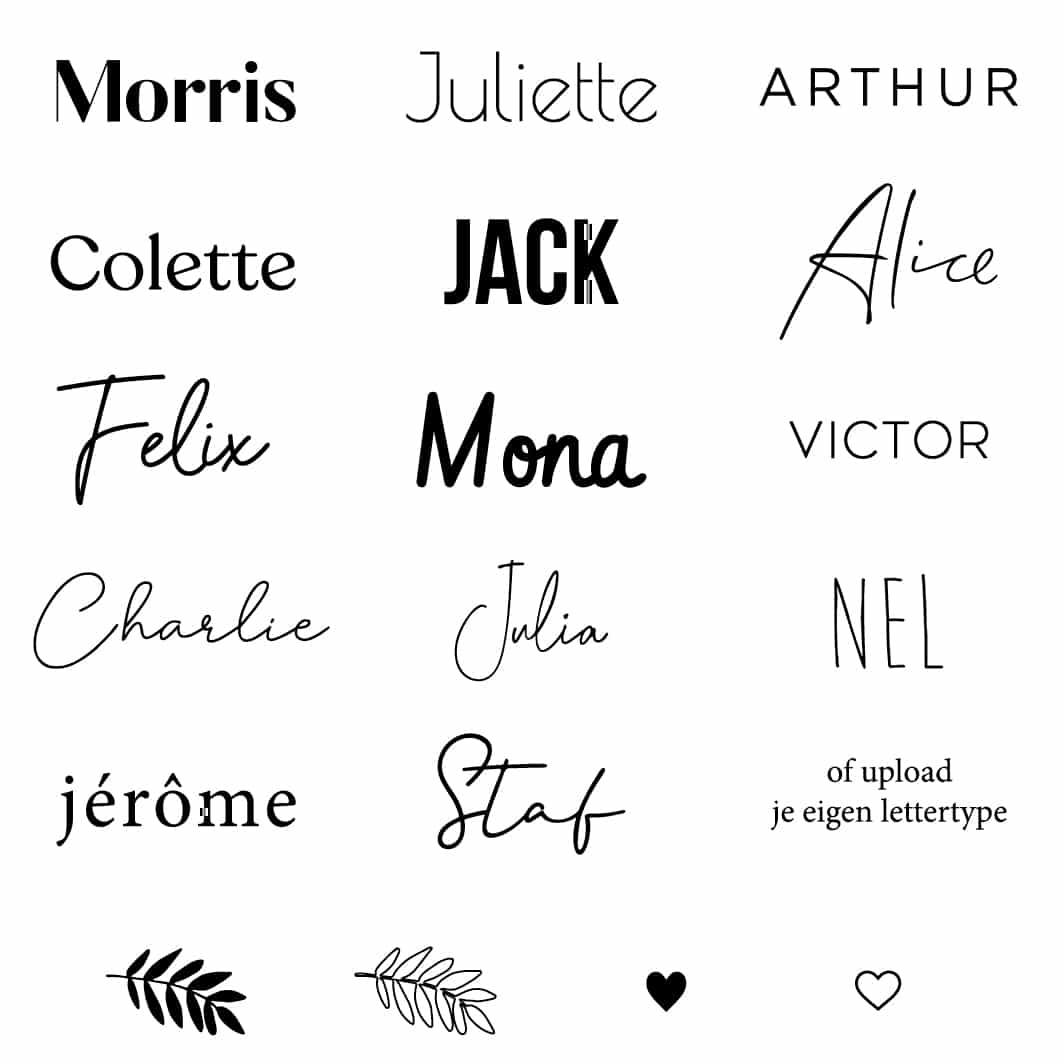 Of zelf een lettertype doorgeven. Indien je zelf een lettertype doorgeeft, dan hebben we hiervoor een OTF of TTF bestand nodig of een PDF met de naam in outlines.