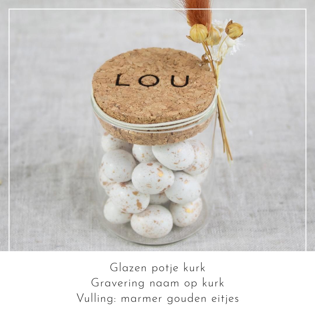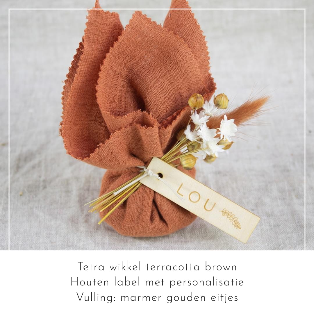 – Vulling voor de tetra wikkel, en/of glazen potjes met mini eitjes marmergoud.
