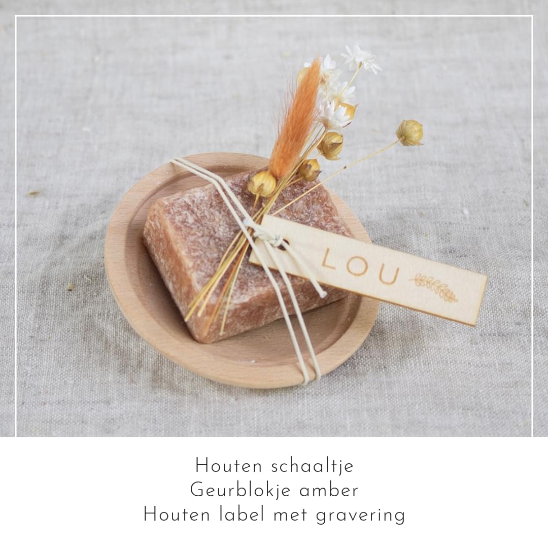 – Presentatiematerialen zijn niet inbegrepen. De presentatietray en de walnoot vaasjes kan je apart bijbestellen. Eventueel kan je ook een houten kaarthouder voorzien om het communiekaartje of een foto erbij te presenteren.