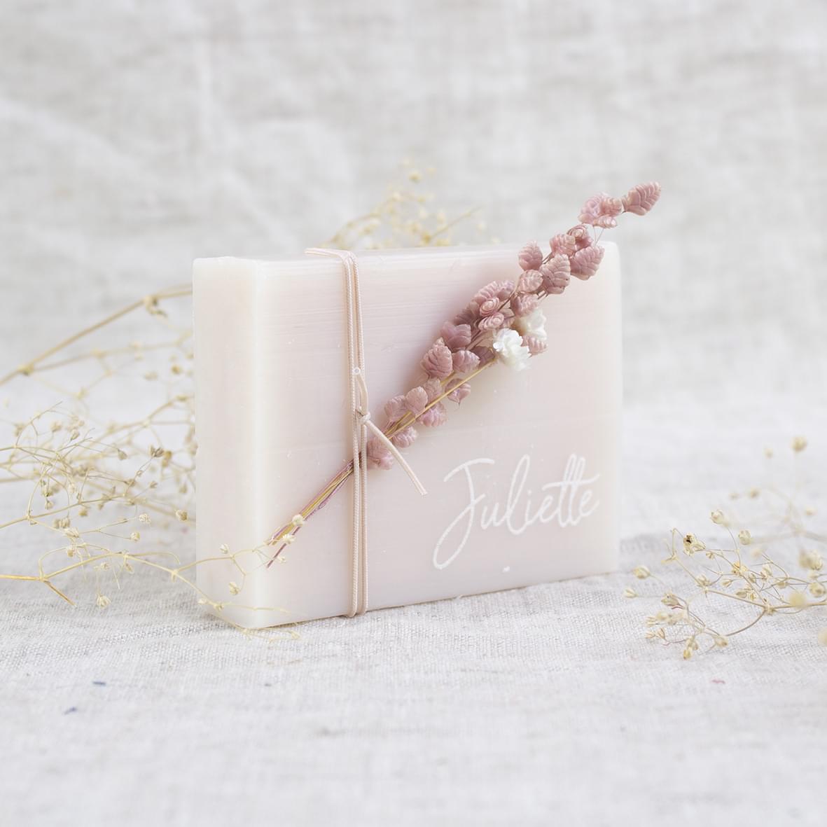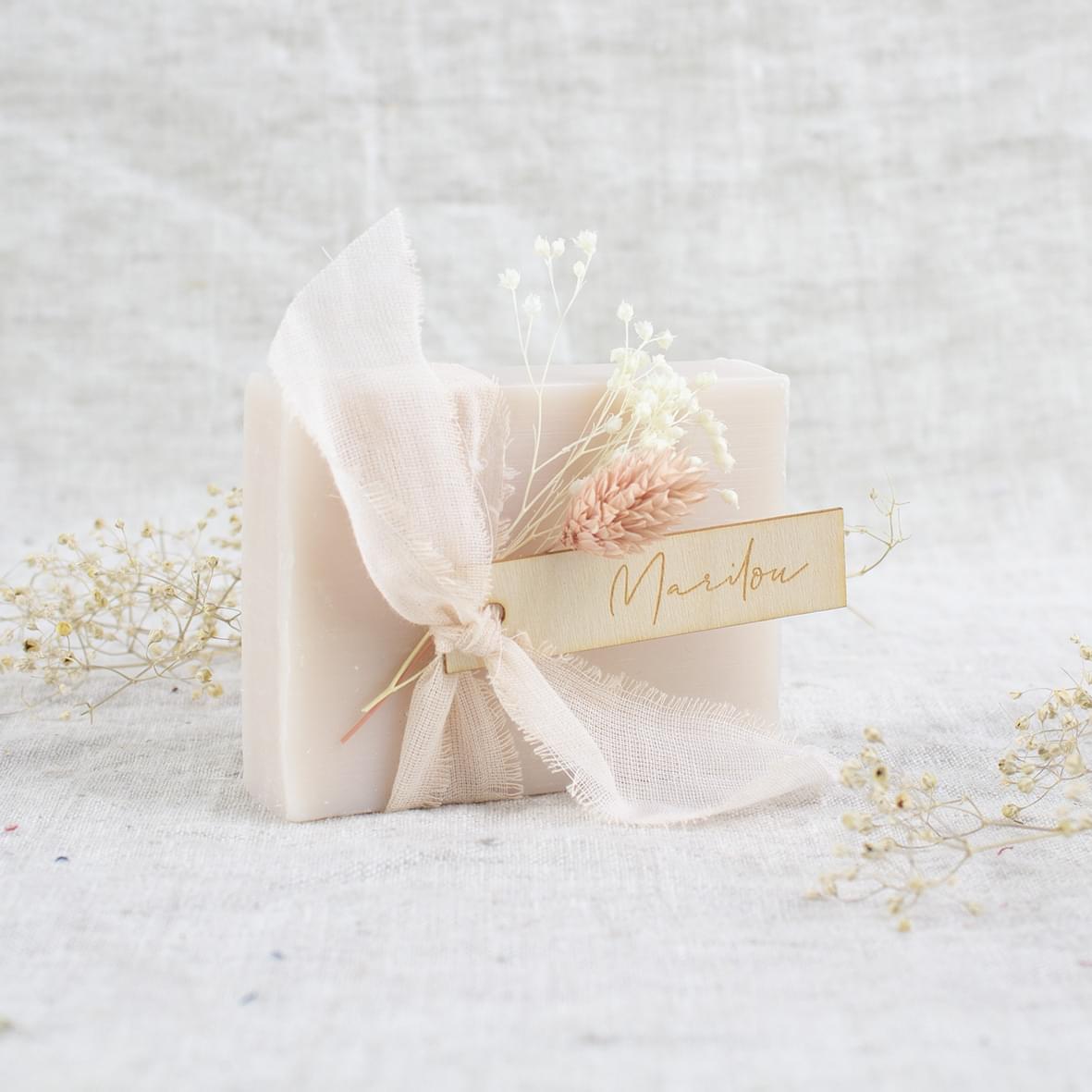 Werk af met een kalkpapier wikkel (apart bij te bestellen) om een vinyl sticker erop te kleven. Ga voor een houten label of laat het zeepje graveren