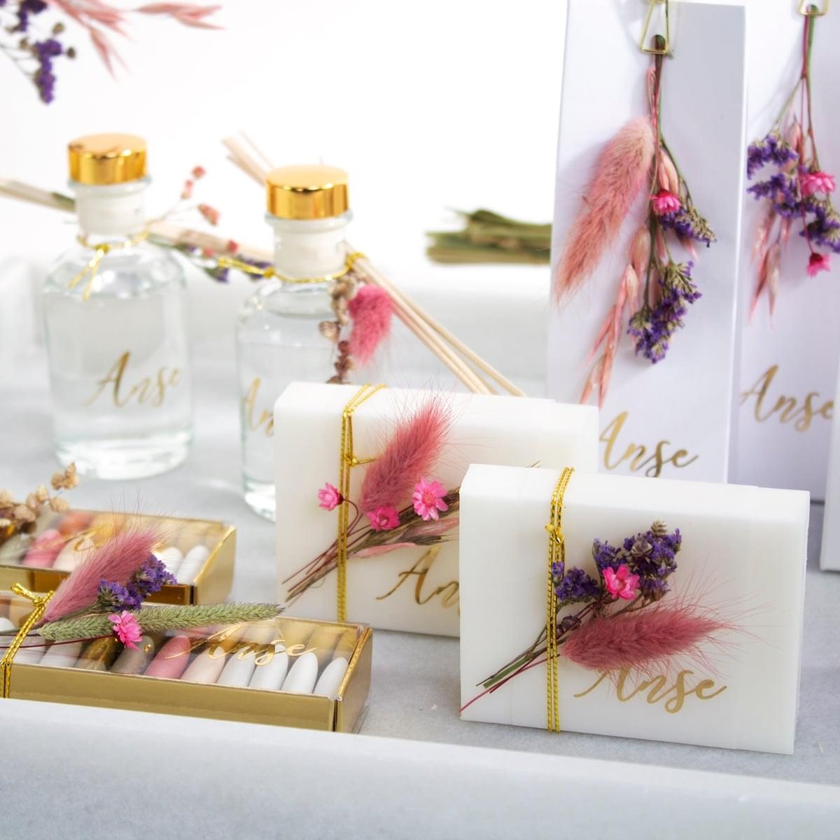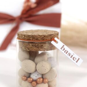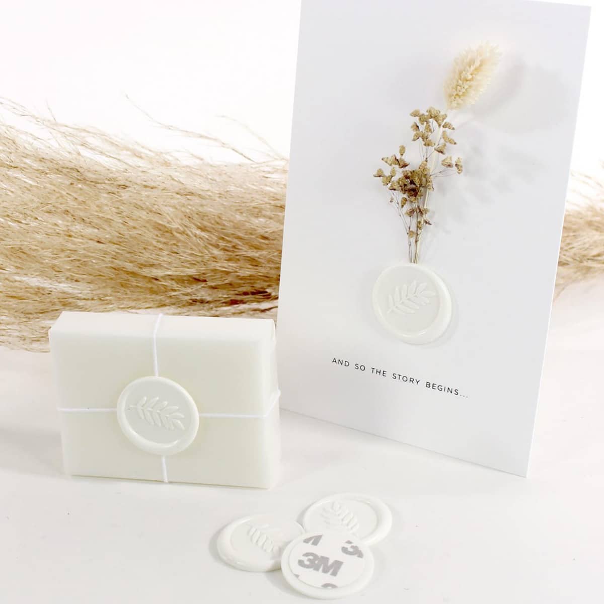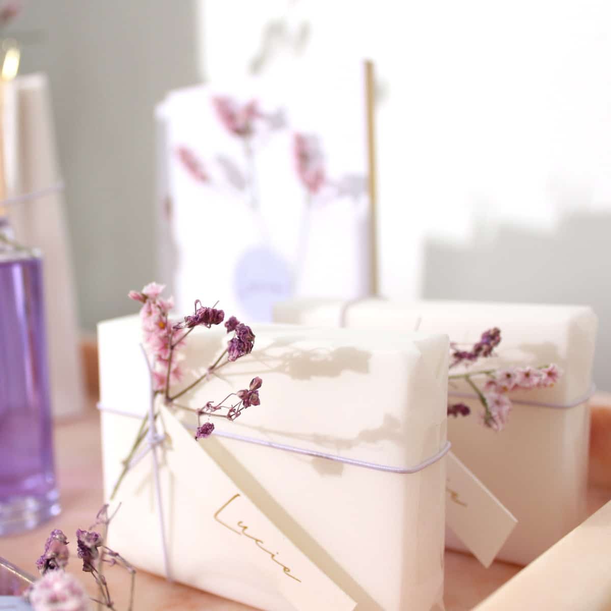 De zeepjes zijn shrink wrapped (plastic folie). Je kan hierover een sticker kleven of werken met een kalkpier om de zeep (zoals op de productfoto) te verpakken. Het kalkpapier is lichtdoorlatend zodat de kleur van de zeep mooi doorschijnt. Je kan als extra optie kiezen voor een blanco kalkpapier.