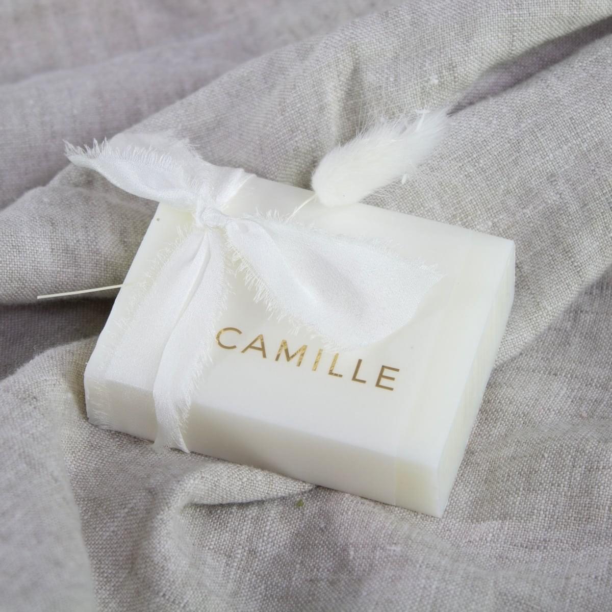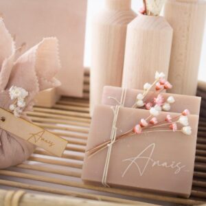 Werk af met een kalkpapier wikkel (apart bij te bestellen) om een vinyl sticker erop te kleven. Ga voor een houten label of laat het zeepje graveren.