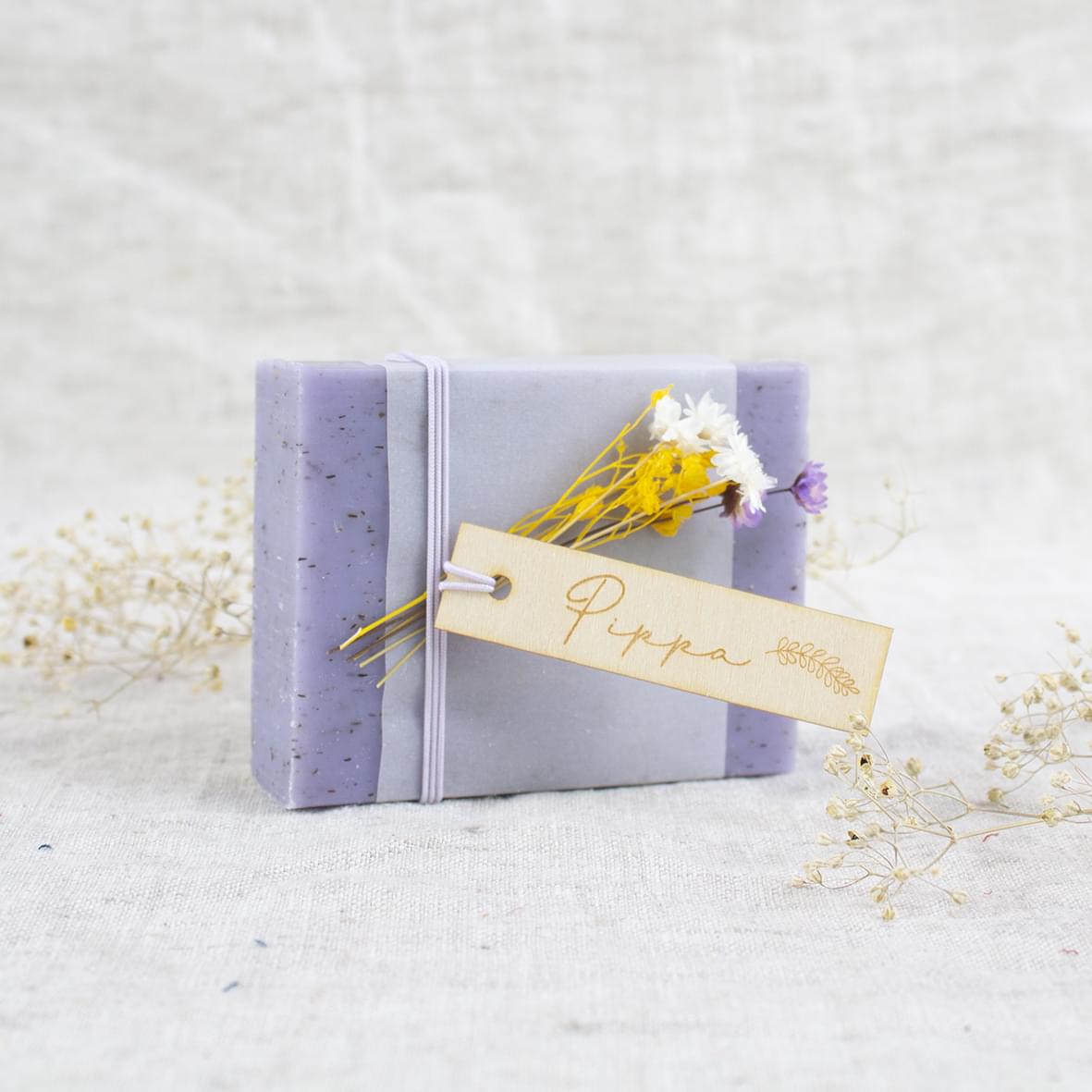 Werk af met een kalkpapier wikkel (apart bij te bestellen) om een vinyl sticker erop te kleven. Ga voor een houten label of laat het zeepje graveren.