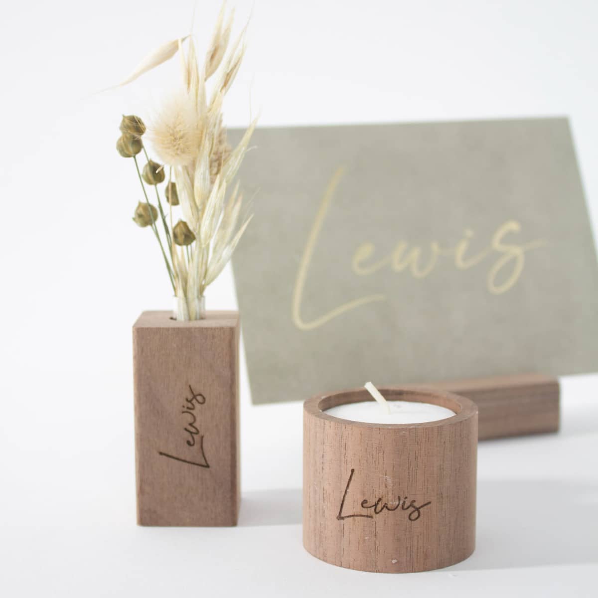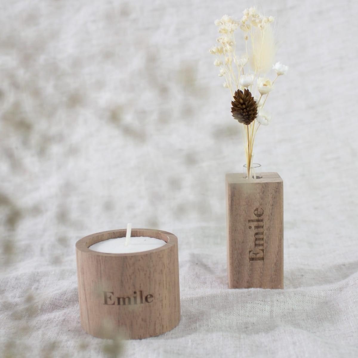 Combineer met de houten vaasjes en de kaarthouder in hetzelfde hout.