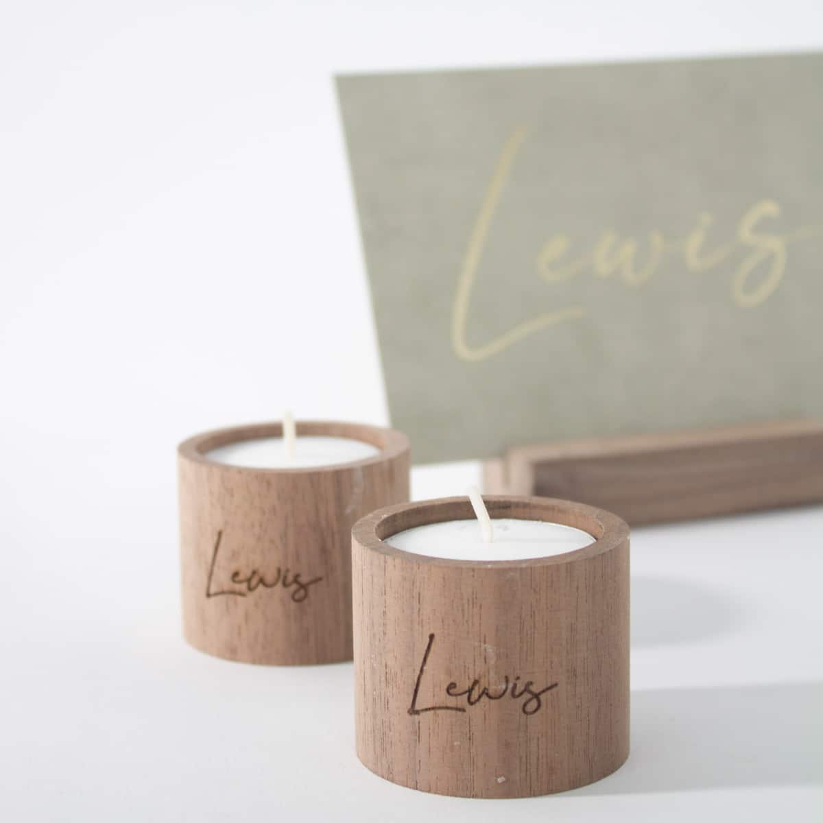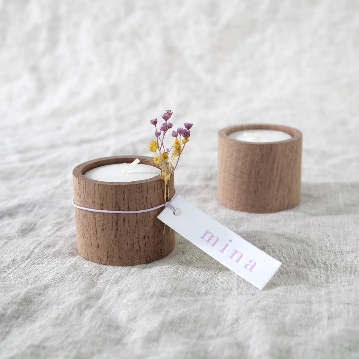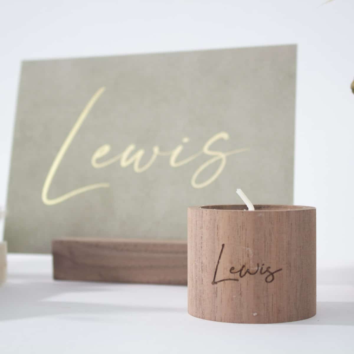 Kaarsje kan je afwerken met een label. Je kan deze kaarsjes ook met gravering bestellen.