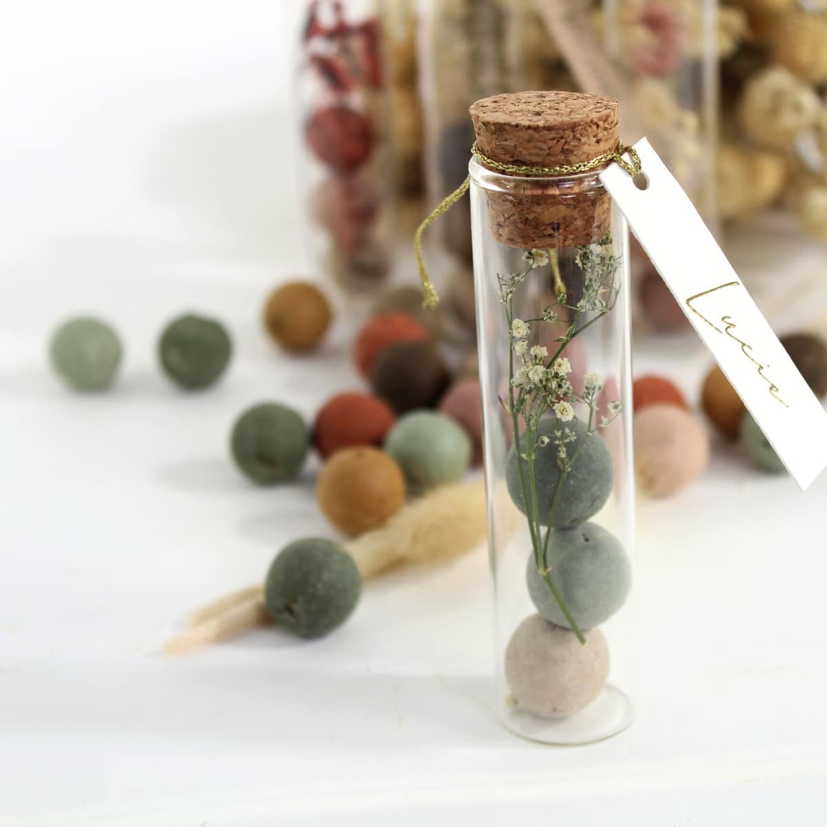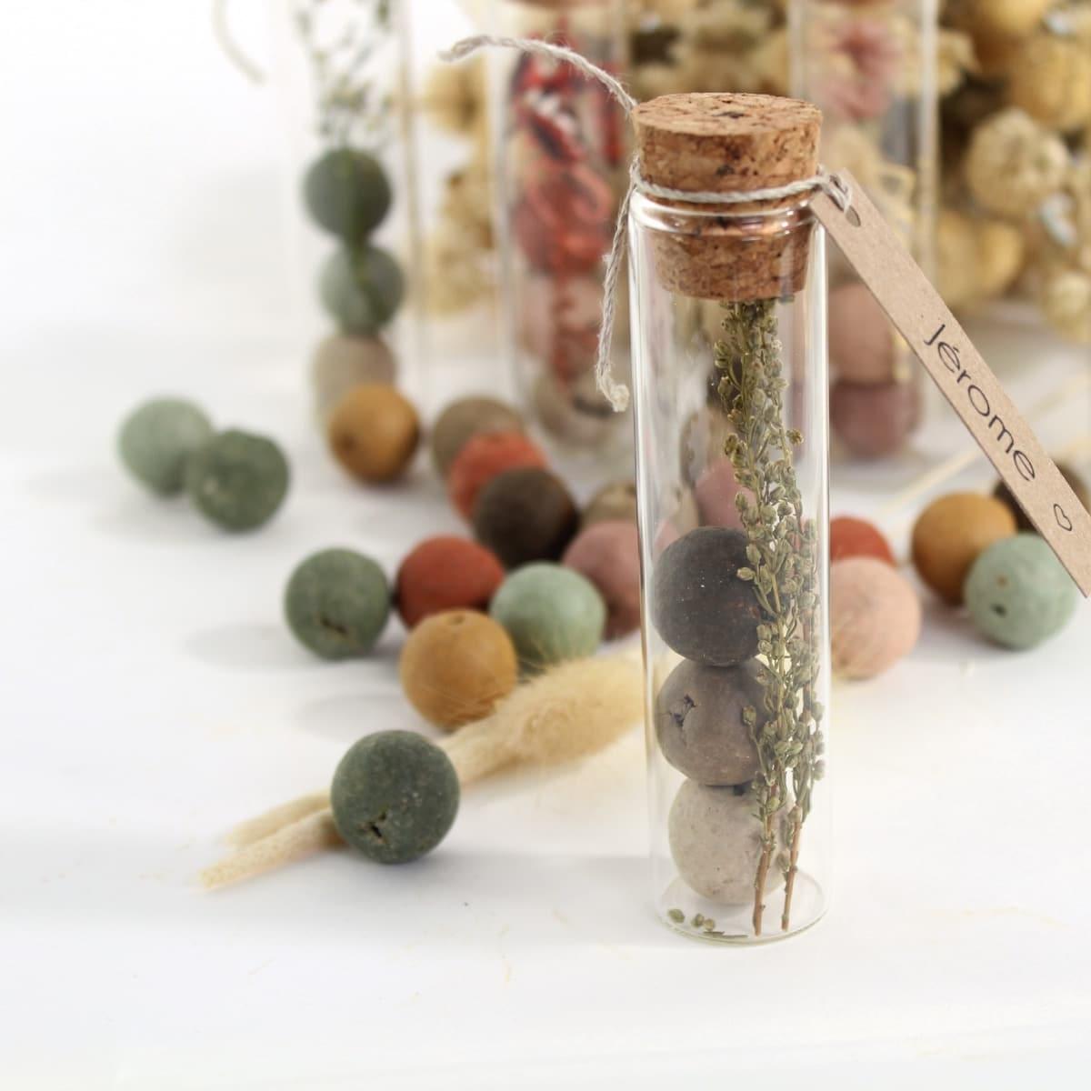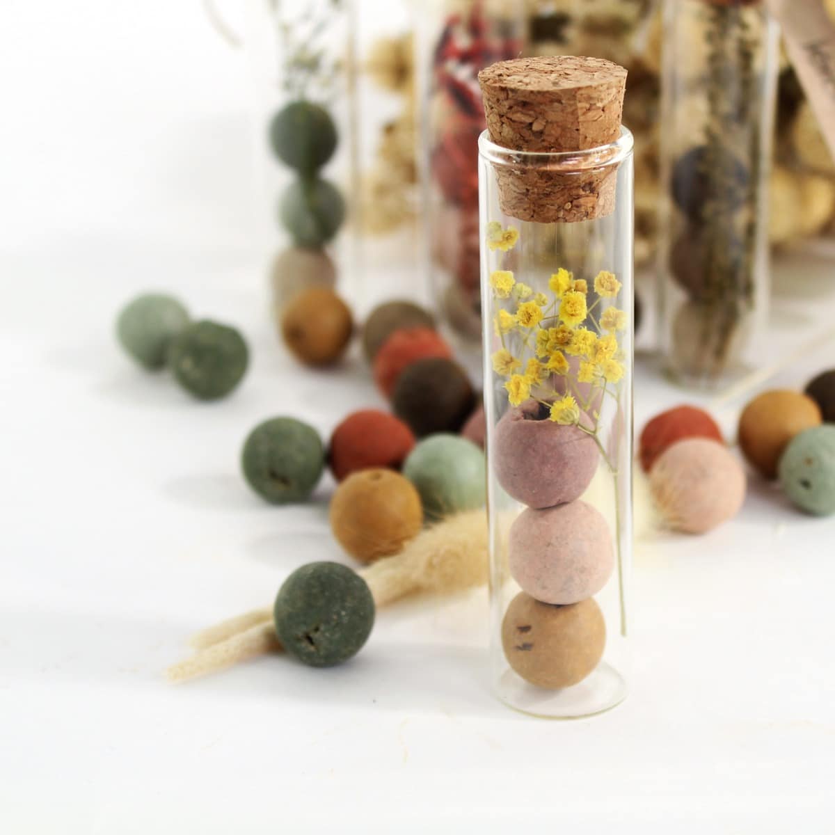 Verpak ze bijvoorbeeld in een proefbuisje, een cotton bag of een terracotta schaaltje