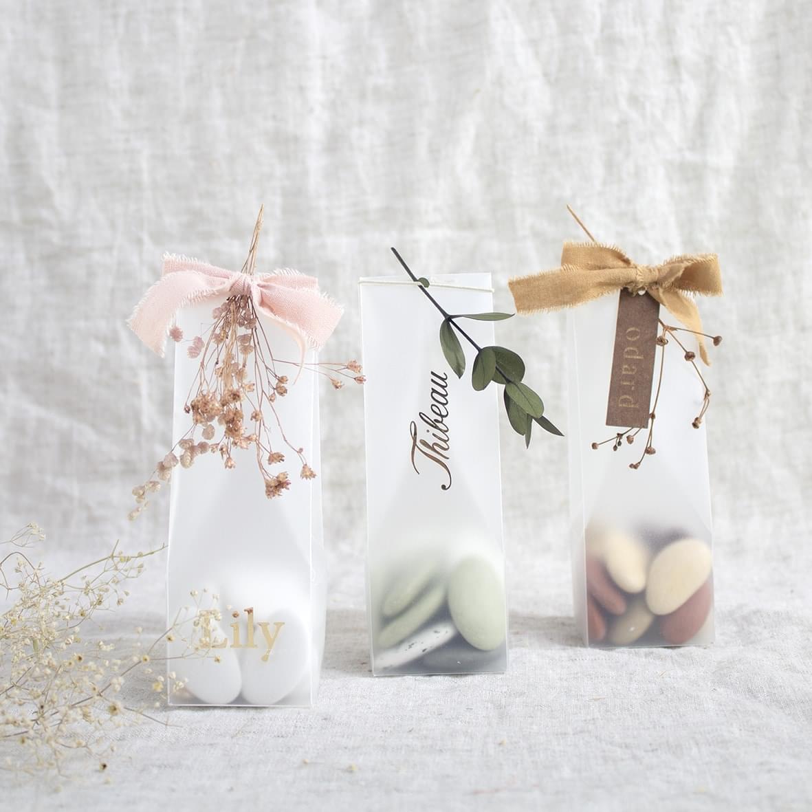 We lieten ze maken in 4 verschillende modellen. Een mini doosje voor een suikerlolly (té schattig!) – een klassiek hoog doosje – een vierkant doosje en een balkdoosje voor suikerbonen of potloden.