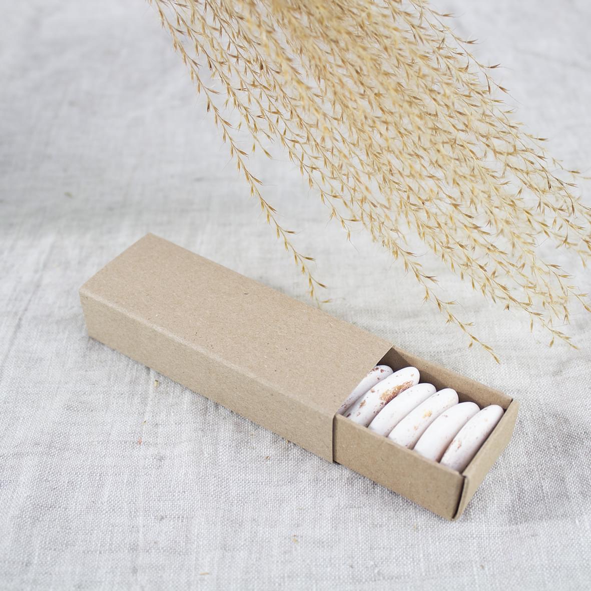 De suikerbonen passen mooi op een rijtje in het doosje.