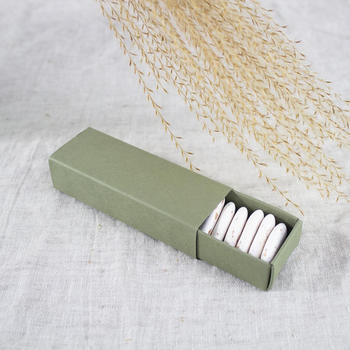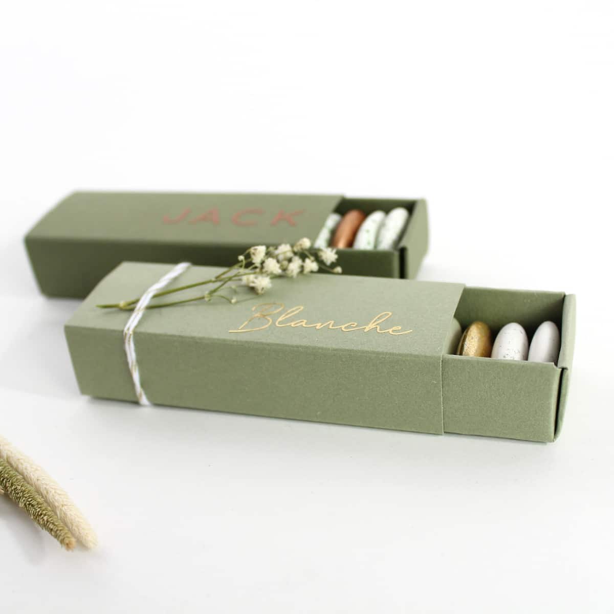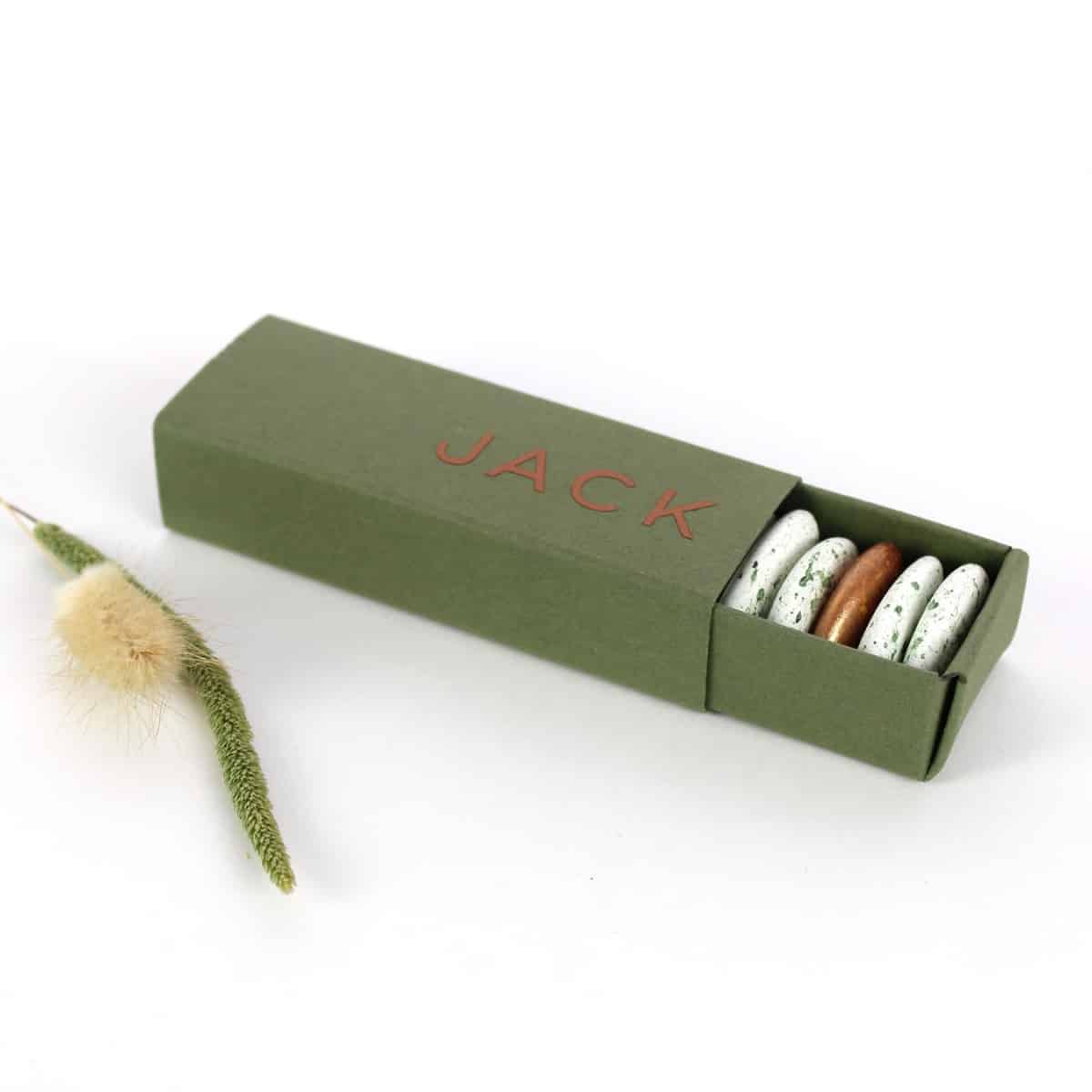 De suikerbonen passen mooi op een rijtje in het doosje.