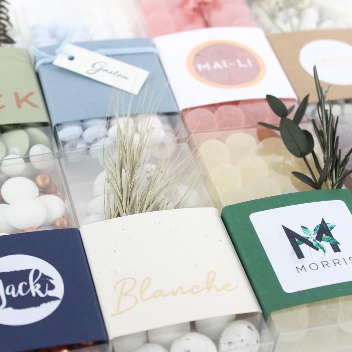 Werk af met een stickertje op de sleeve en/of steek een aantal takjes droogbloemen achter de sleeve.