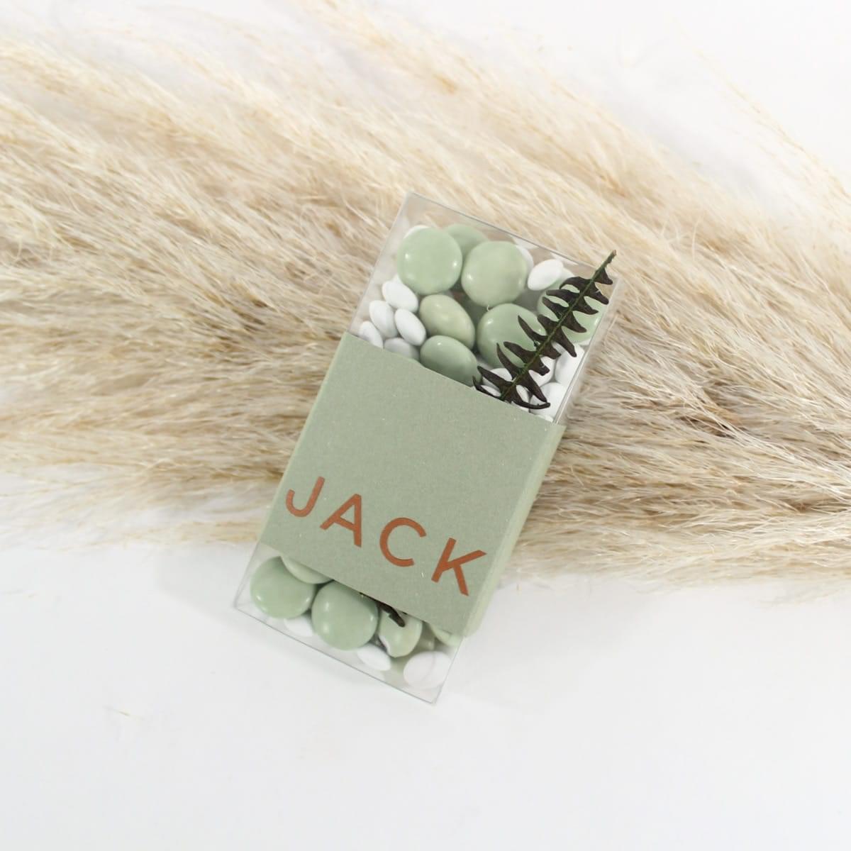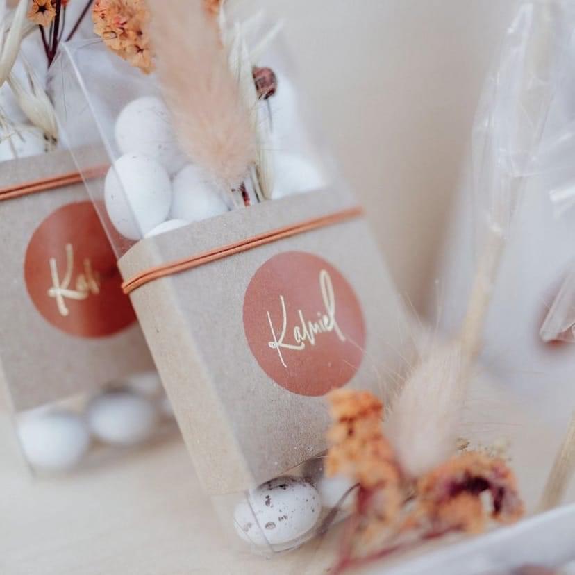 Werk af met een stickertje op de sleeve en/of steek een aantal takjes droogbloemen achter de sleeve.