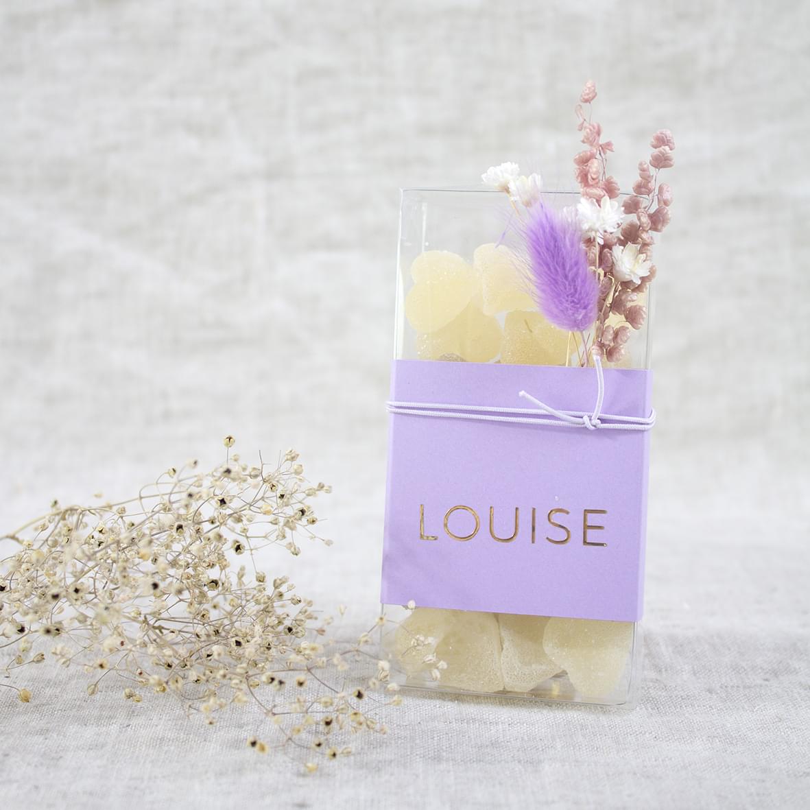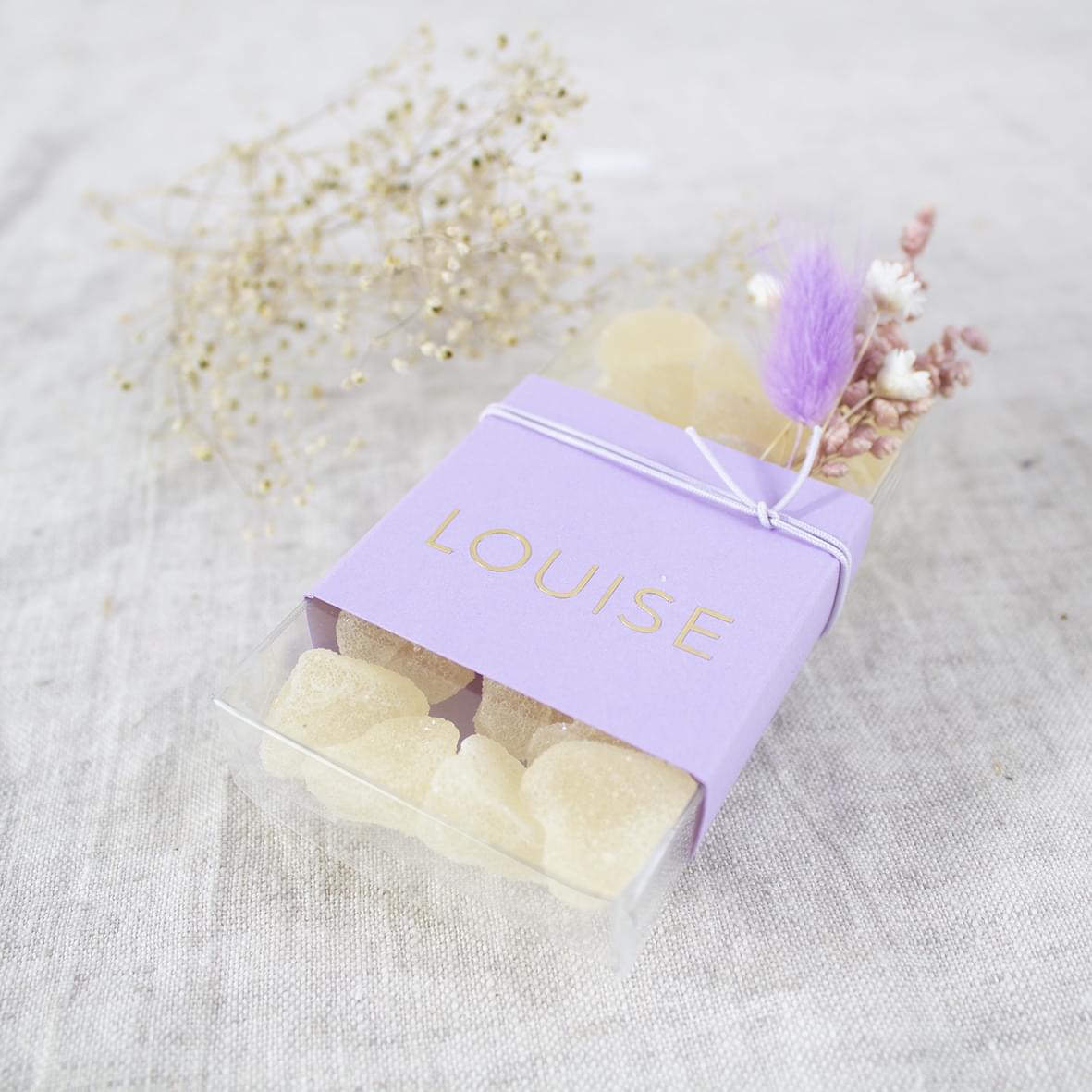 Snoepdoosje lila is ideaal voor het verpakken van Snoepketting wit, snoep, of Nougat blokjes.