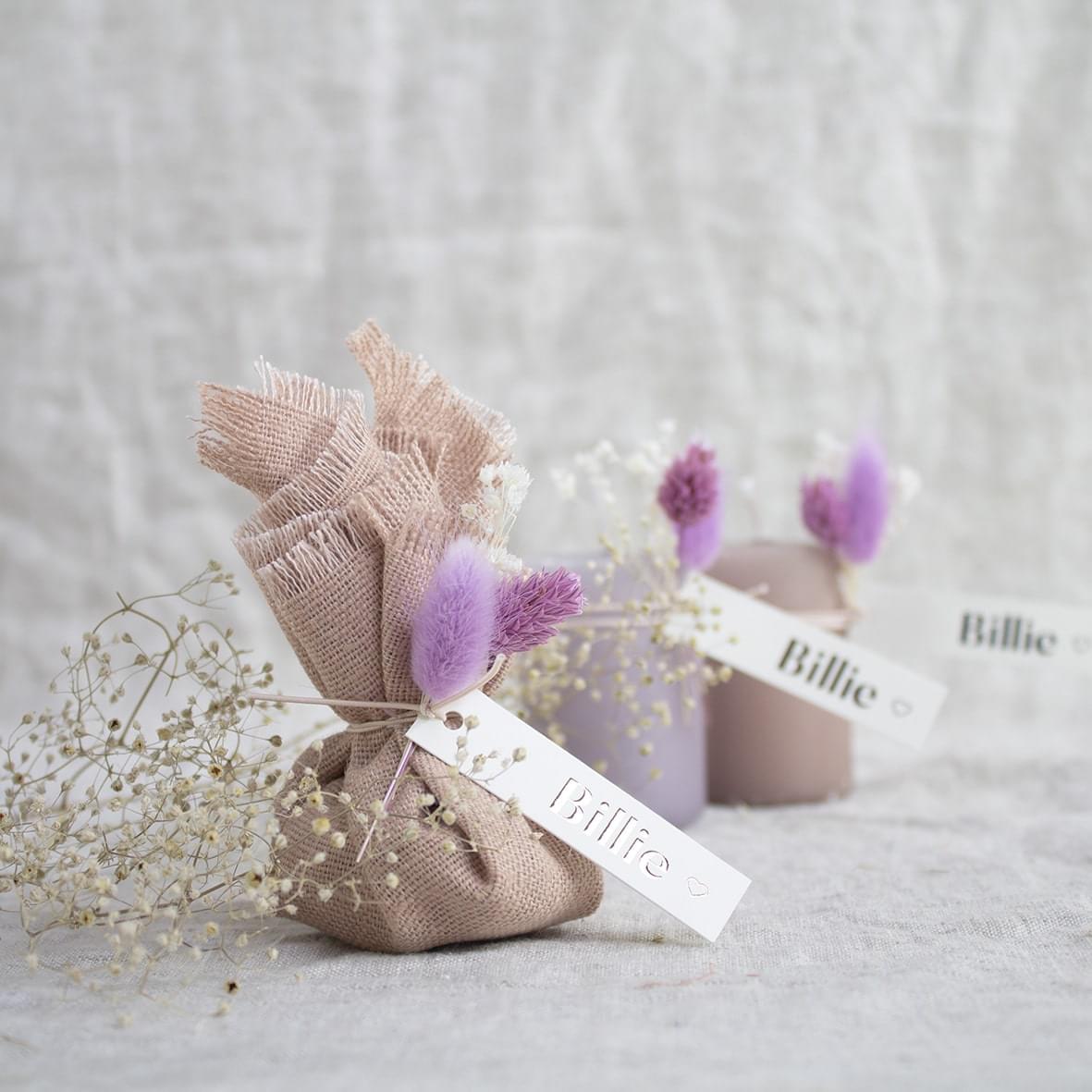 Werk af met een touwtje of elastiek. Ga voor een (houten) label en knoop een bloemetje eraan.