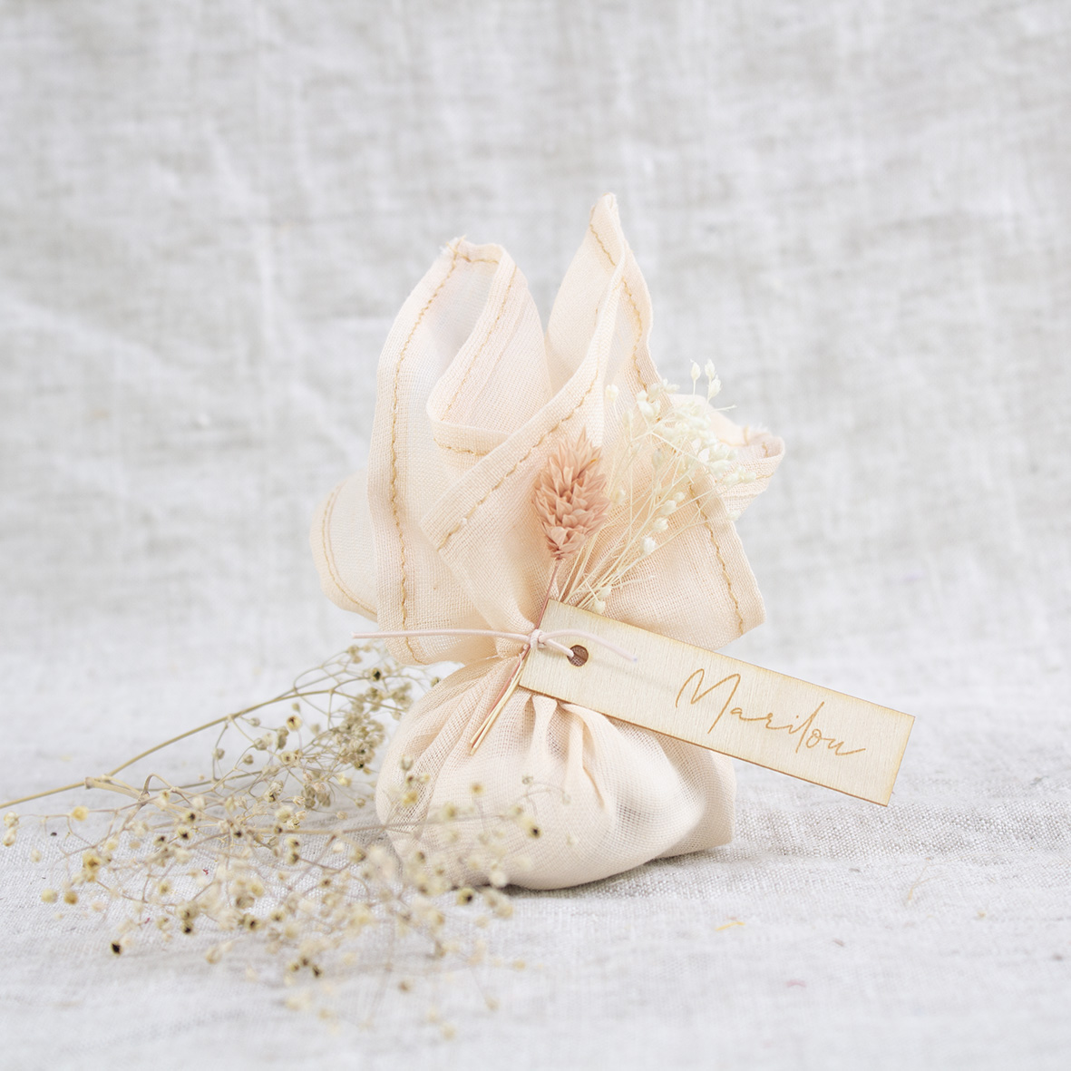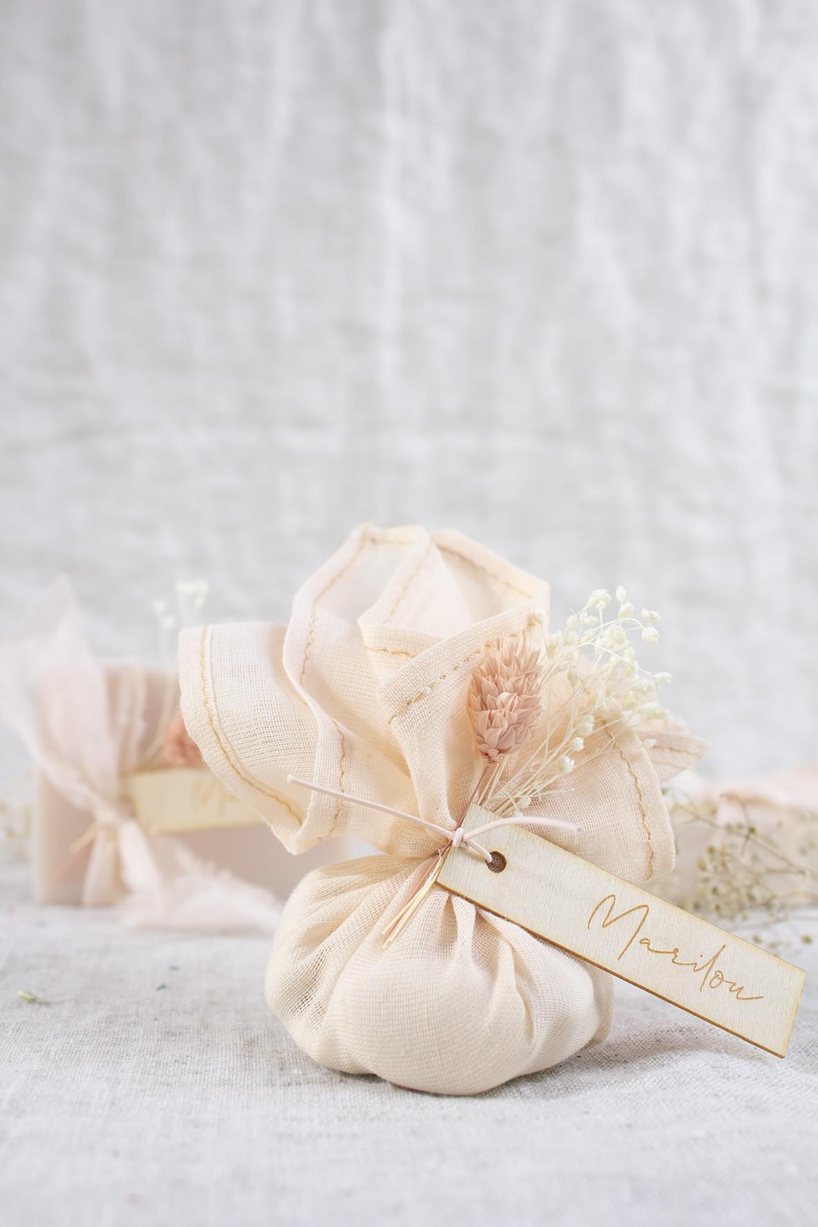 Werk af met een touwtje of elastiek. Ga voor een houten label en knoop een bloemetje eraan.